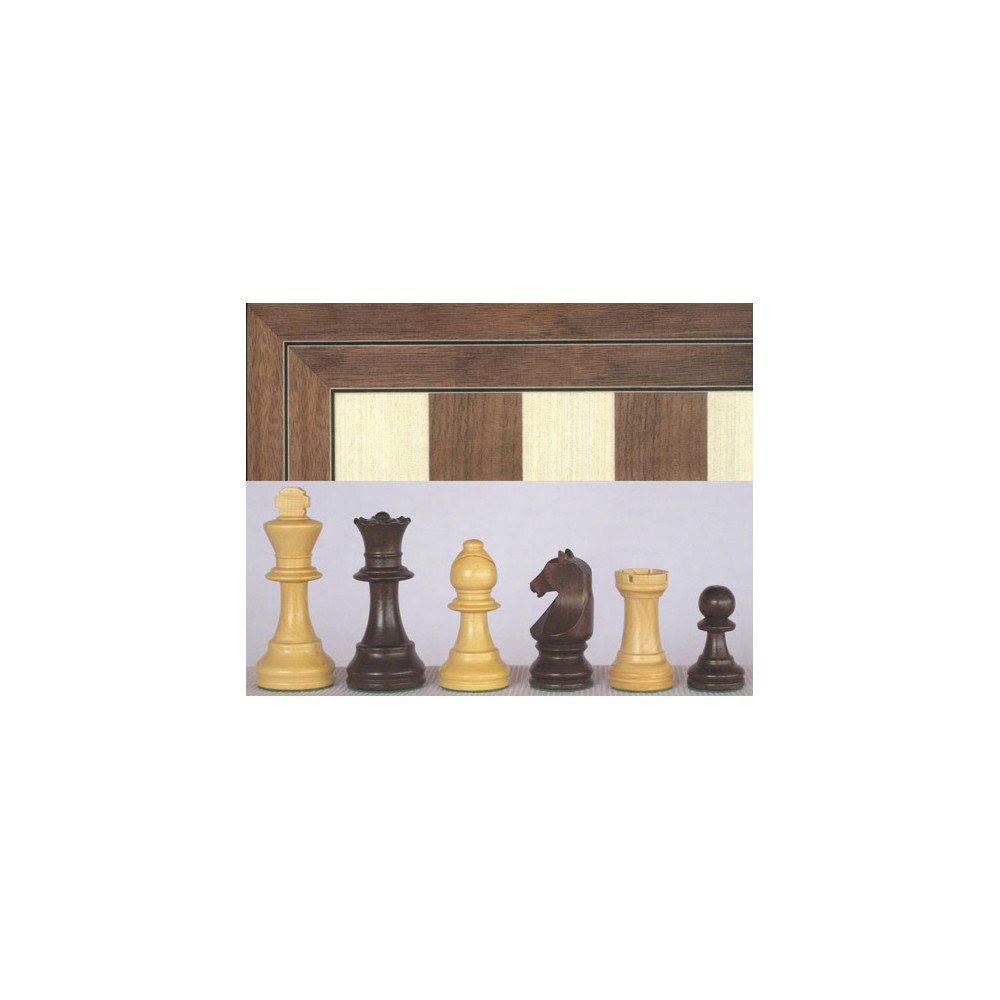 Tablero con madera de sicomoro para los cuadros claros, y nogal para los oscuros. El marco es de nogal con doble cadenilla.