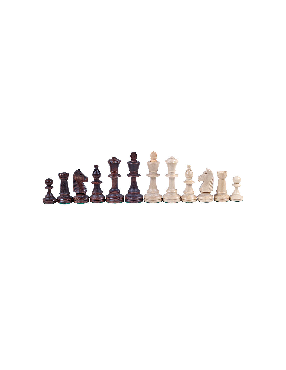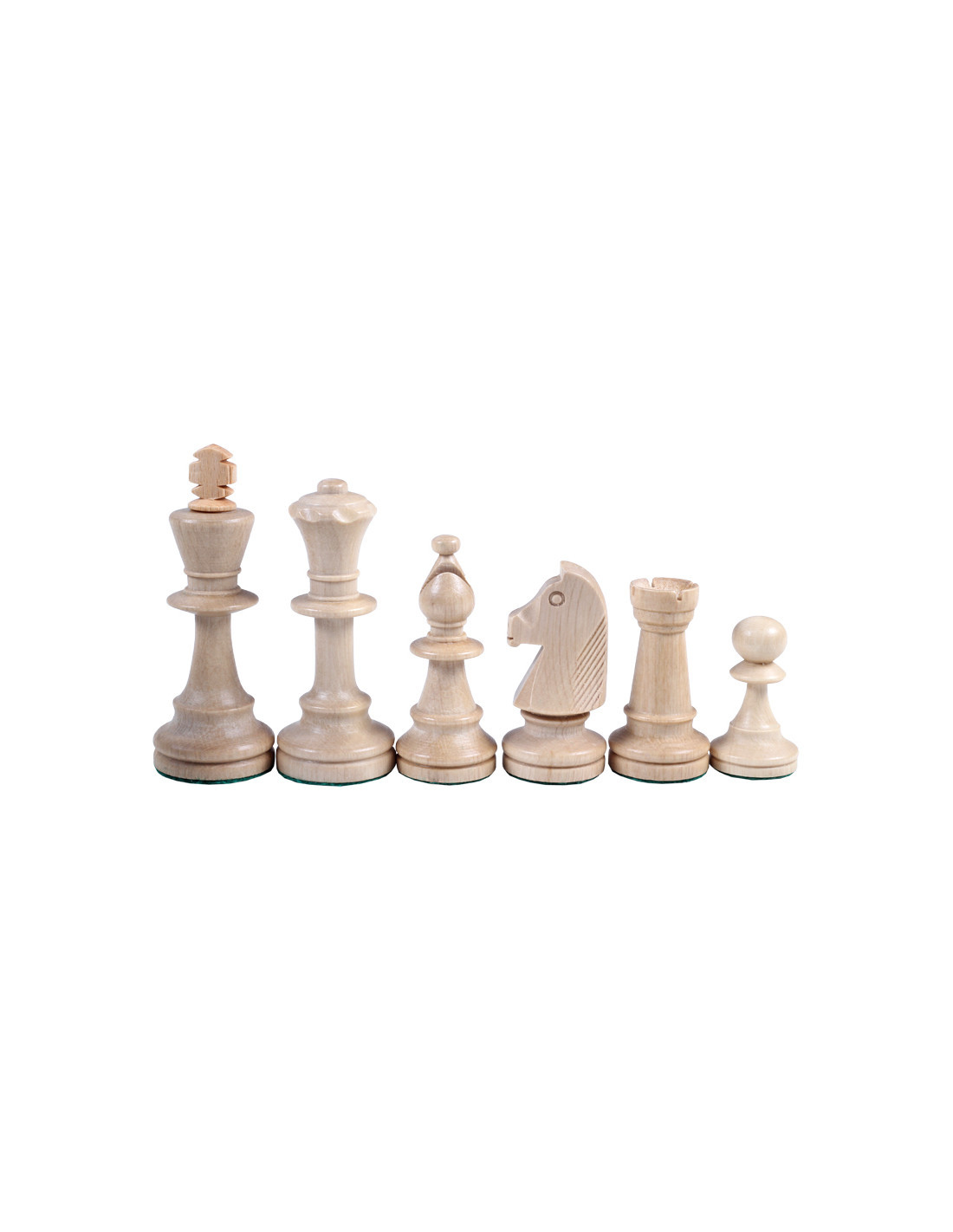 Estas piezas de ajedrez incluye una caja de madera barnizada como conjunto. Este conjunto es ideal para  tableros de ajedrez con escaques de 45 o 50 mm. Las piezas de ajedrez están hechas de madera de carpe. Cuidadosamente elaboradas, plomadas y equipadas con almohadillas de fieltro en la parte inferior, estas piezas se sienten bien en la mano y se deslizan muy bien a lo largo del tablero
