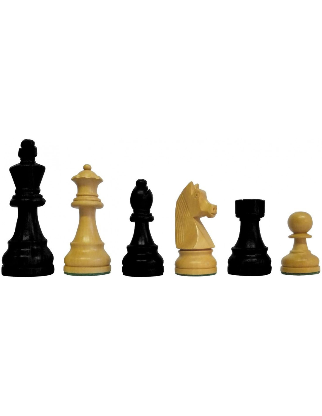 Piezas de alta calidad del modelo Staunton. Estas piezas están plomadas y tienen fieltro en su base para que se deslicen con suavidad sobre el tablero. Las piezas claras son de Boj y las oscuras de Sheesham.