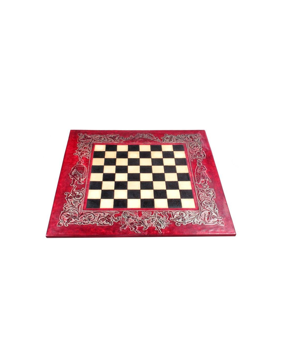 Tablero de ajedrez en cuero repujado con escaques de 3,5cm. En la decoración destacamos una cenefa decorativa alrededor con motivos medievales. Ideal regalo tanto para amantes de este deporte como para decorar cualquier estancia.